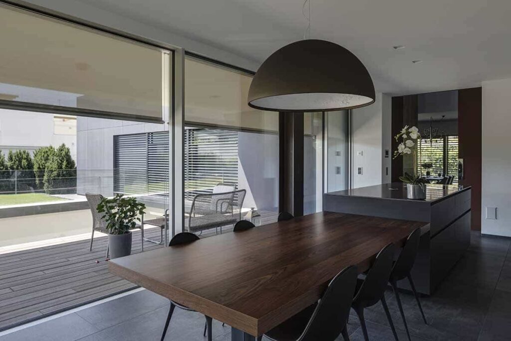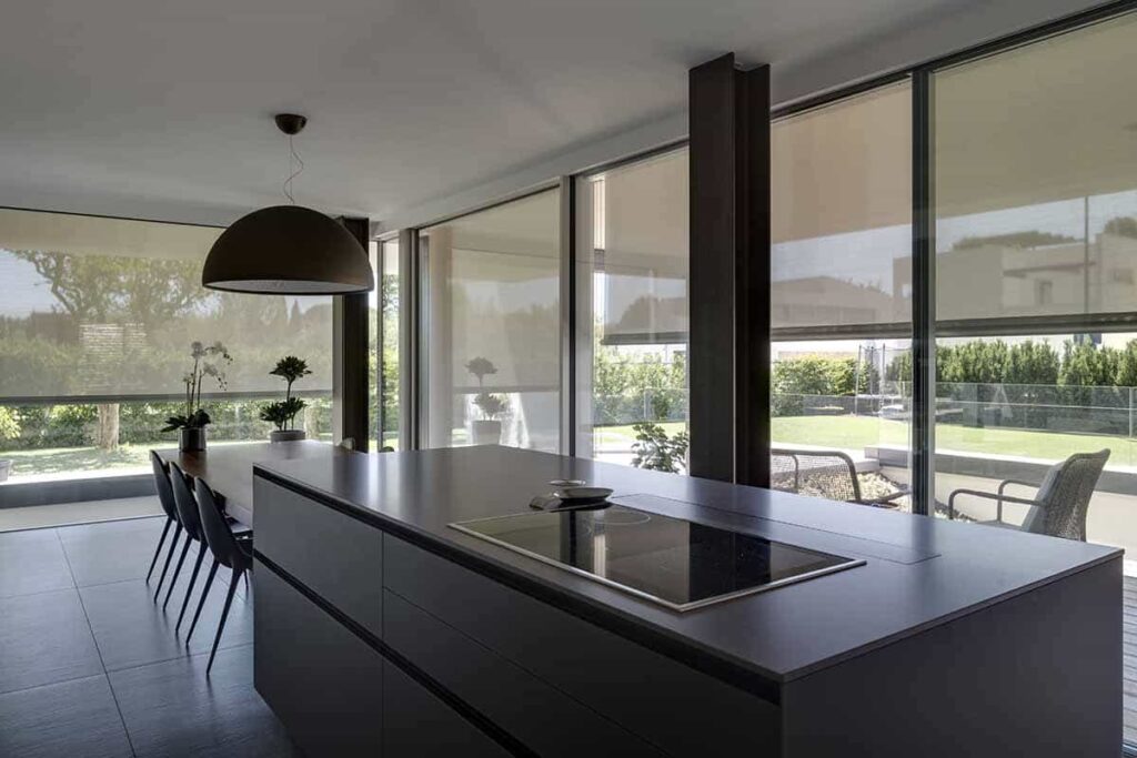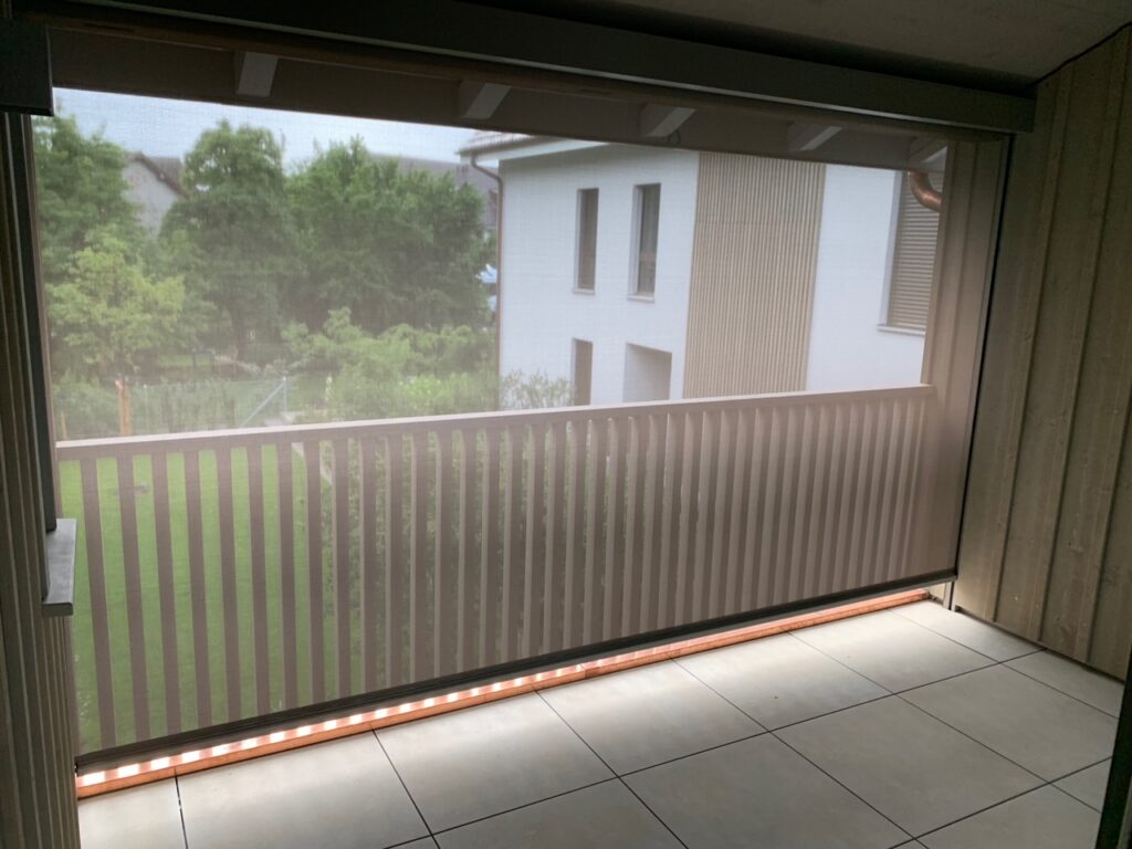 Fassadenmarkisen, auch Senkrechtmarkisen genannt, laufen direkt vor dem Fenster nach unten und bieten zuverlässigen Schutz vor Sonne, Hitze und neugierigen Blicken. Das Tuch bleibt straff, die Führungsschienen sind unauffällig – so bleibt die Optik der Fassade ruhig und modern.